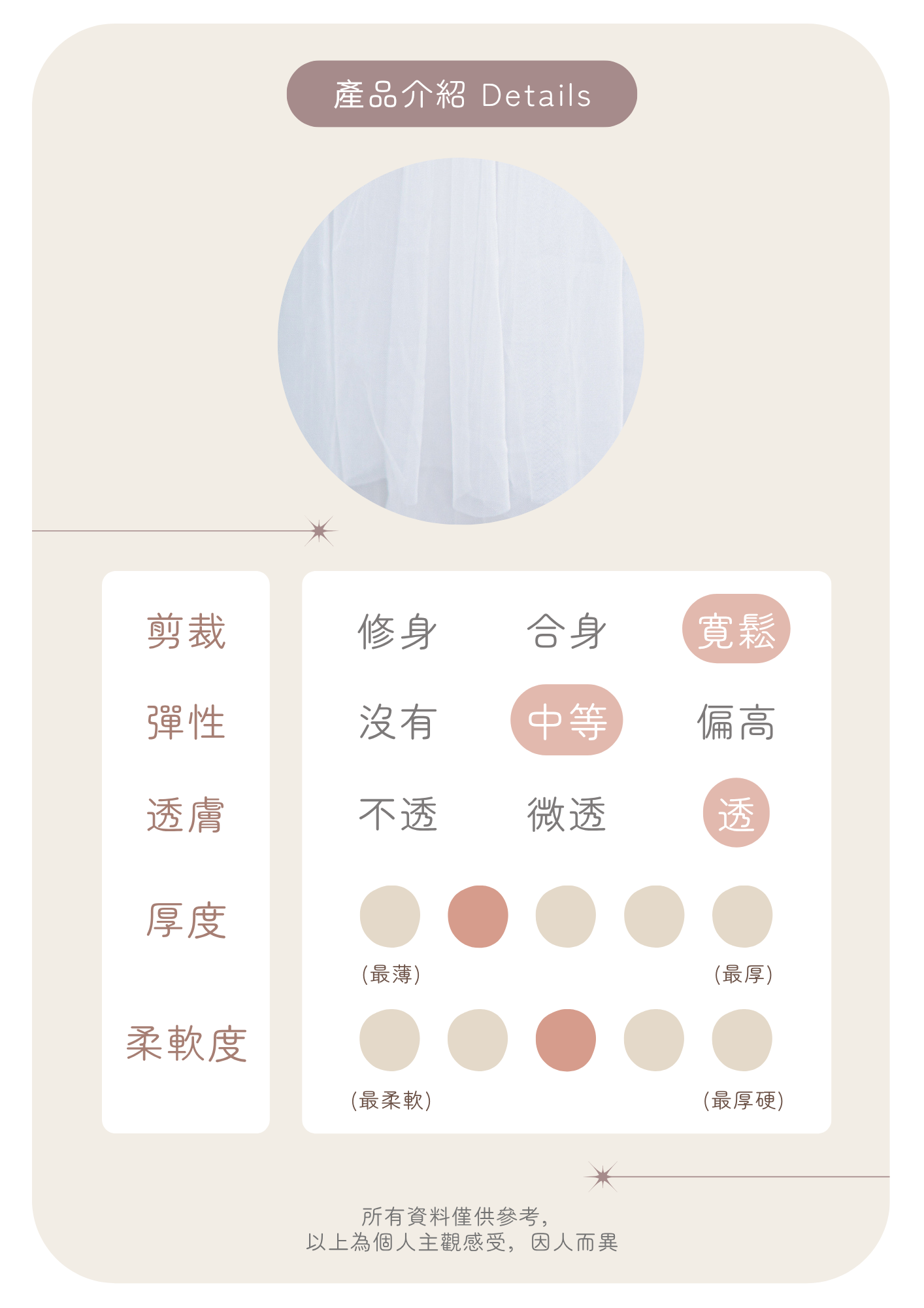 🦦: 薄紗質地較透薄 容易因應陽光或背景顏色而改變 建議下單前斟酌考慮喔~