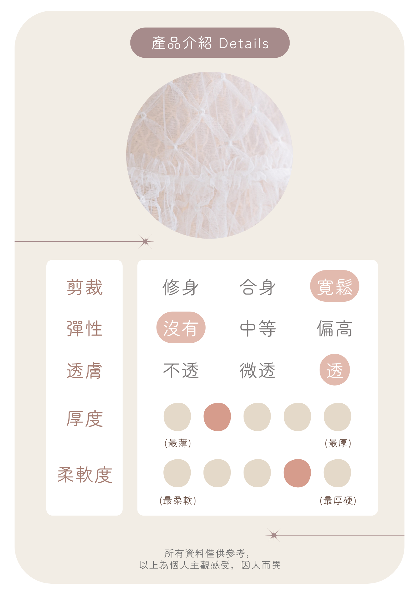 🦦: 薄紗質地較透薄 容易因應陽光或背景顏色而改變 建議下單前斟酌考慮喔~