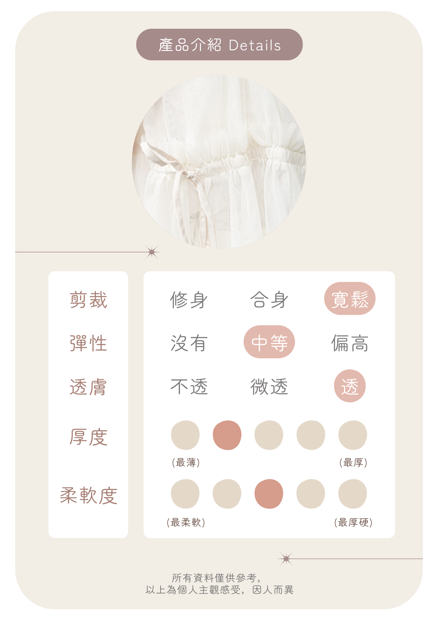 🦦: 薄紗質地較透薄 需要自行打底 而且容易因應陽光或背景顏色而改變 建議下單前斟酌考慮喔~