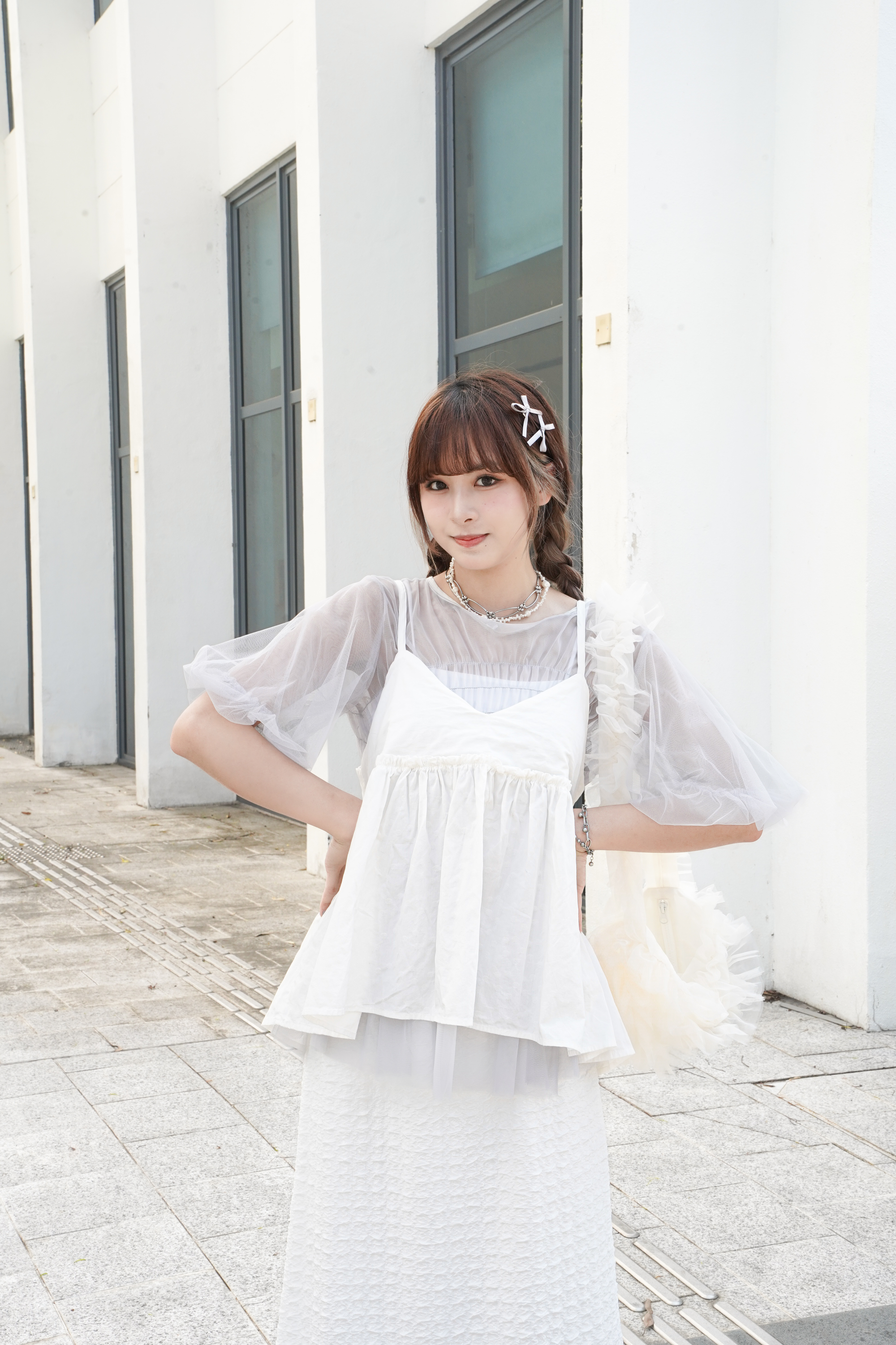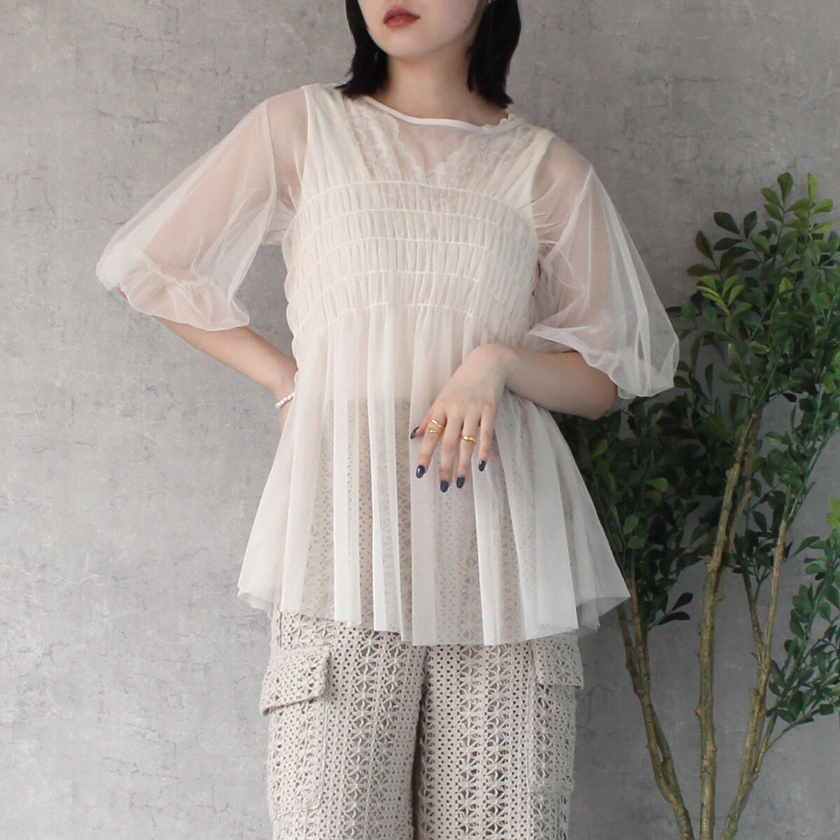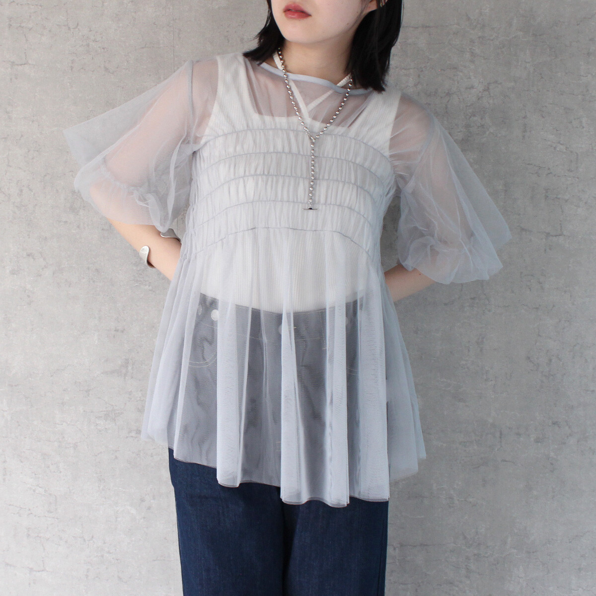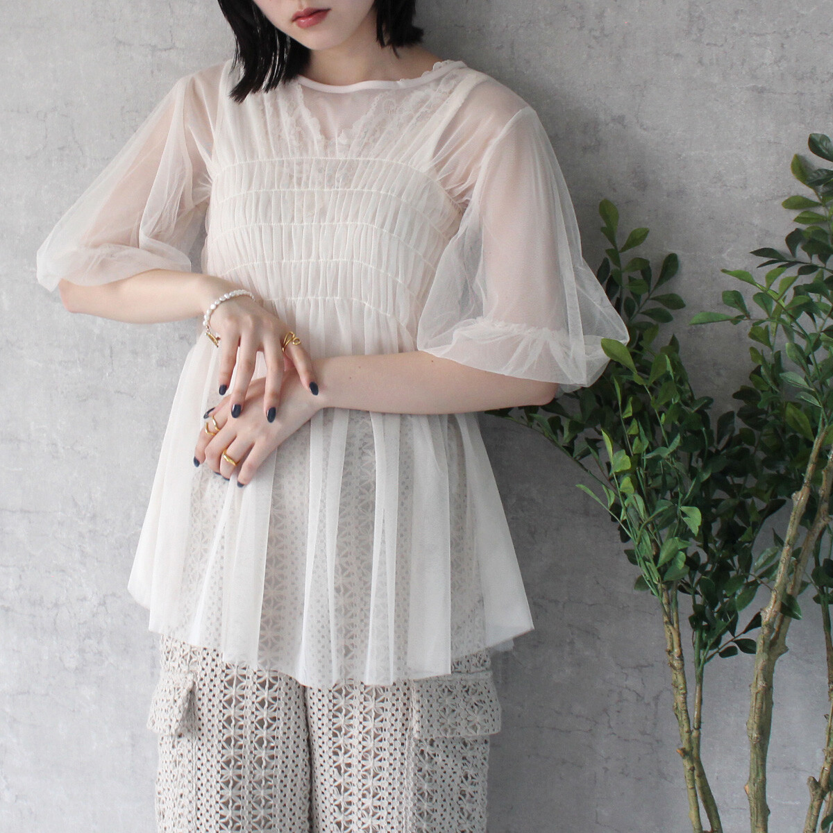 〘 皺褶泡泡袖傘形薄紗 〙